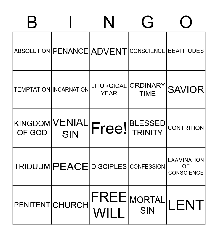 This bingo card has a free space and 30 words: CHURCH, GRACE, VENIAL SIN, MISSION, ABSOLUTION, ADVENT, INCARNATION, DISCIPLES, BLESSED TRINITY, FREE WILL, CONTRITION, LENT, MORTAL SIN, ORIGINAL SIN, SAVIOR, SIN, CONFESSION, TRIDUUM, PEACE, BEATITUDES, KINGDOM OF GOD, JUSTICE, PENANCE, ORDINARY TIME, TEMPTATION, CONSCIENCE, EXAMINATION OF CONSCIENCE, PENITENT, LITURGICAL YEAR and ABBA.