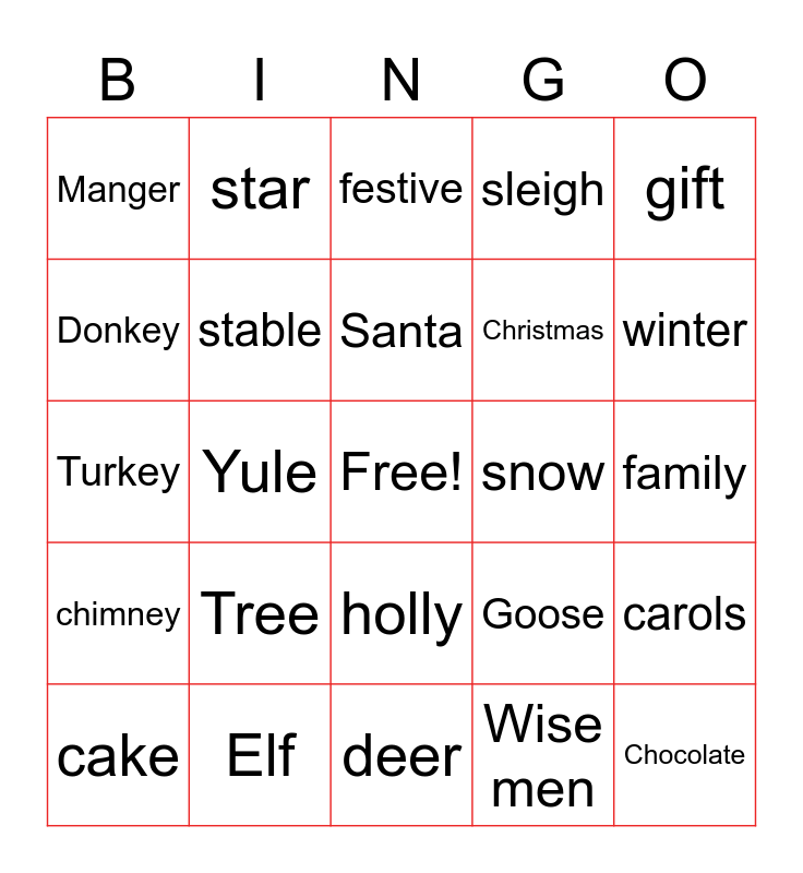This bingo card has a free space and 24 words: Tree, Elf, Santa, cake, gift, Manger, Donkey, star, snow, holly, Christmas, Turkey, Goose, carols, stable, Wise men, family, festive, winter, Yule, Chocolate, chimney, sleigh and deer.