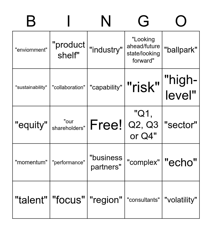 This bingo card has a free space and 113 words: "Next slide", "Organic", "Organic growth", "Culture", "Client-Centric", "New normal", "Looking ahead/future state/looking forward", Three ums or ahhs in sentence, "great question!", "passing it onto _____", "our purpose", "strategy" or "strategies", "Go back a slide", "Good morning/good afternoon/good evening", Three speakers answer one Slido question, "structure", "business partners", "transfer agency" or "TA" or "NATA", "assets under management", "competition", "talent", "industry", "market share", "brand", "talent", "momentum", "focus", "globally"/"around the globe"/"across the globe", "performance", "senior leaders", "high-level", "capability", "our shareholders", "Pivot", "win-win" or "win", "forecast", "endeavour(s)", "circle back", "innovative", "element", "portfolio", "behind the scenes", "market place", "projects", "stand point", "launched" or "launch", "consultants", "sustainability", "critical", "benchmark", "value-add", "Q1, Q2, Q3 or Q4", "firm", "innitiative", "I can answer this one", "drastic", "Private Markets", "wealth management", "competitors", "stable" or "stablize", "echo", "snapshot", "strategic", "platform", "trends", "marketplace", "foundation", "collaboration", "equity", "capital", "sector", "firm", "diversity", "pipeline", "infrastructer", "volatility", "performance", "enviornment", "resources", "passive", "revenue", "product shelf", "Spectrum", "complex", "risk", "challenges", "initiative", "value", "fundamental", "runway", "success", "deep dive", "ballpark", "competency", "data-driven", "onboarding", "analytics", "bottom line", "agile", "liquid"/"liquidate", "institutional", "retail", "allocate"/"allocating", "emerging", "stability", "growth", "region", "achieve", "Quarter", "markets", "assets", "project" and "numbers".