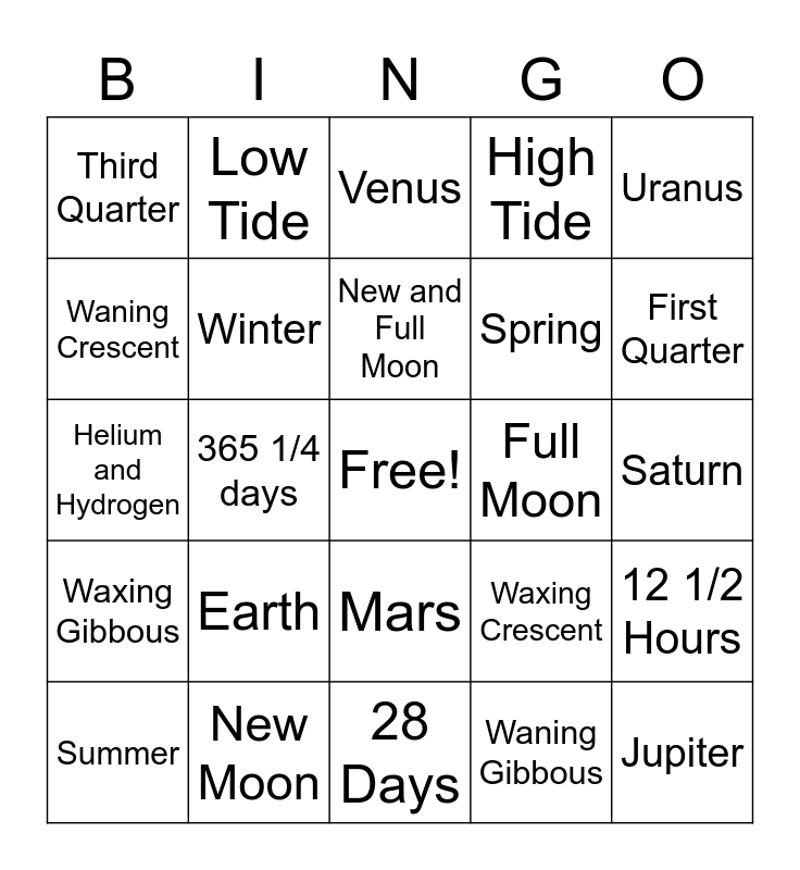 This bingo card has a free space and 29 words: Summer, Mercury, 365 1/4 days, 24 Hours, Third Quarter, Venus, Winter, Earth, Full Moon, New Moon, Saturn, Jupiter, 28 Days, Waning Gibbous, First Quarter, Fall, Mars, Waxing Gibbous, Uranus, Helium and Hydrogen, Waxing Crescent, Neptune, Spring, Waning Crescent, High Tide, Low Tide, 12 1/2 Hours, New and Full Moon and First and Third Quarter Moons.