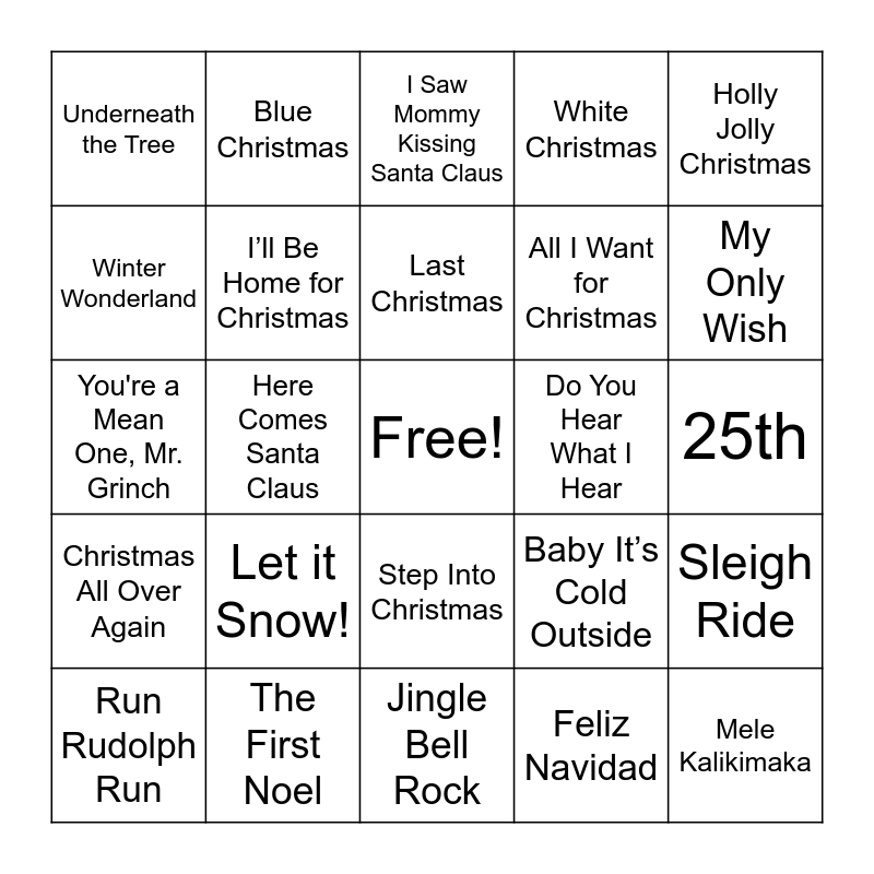 This bingo card has a free space and 47 words: Have Yourself a Merry Little Christmas, Mele Kalikimaka, Rockin’ Around the Christmas Tree, Jingle Bell Rock, Let it Snow!, Joy to the World, Blue Christmas, Santa Claus is Comin’ to Town, Winter Wonderland, Silver Bells, I’ll Be Home for Christmas, White Christmas, Sleigh Ride, Baby It’s Cold Outside, Rudolph the Red Nosed Reindeer, Santa Tell Me, Last Christmas, Do You Hear What I Hear, Little Drummer Boy, Holly Jolly Christmas, Here Comes Santa Claus, Feliz Navidad, Underneath the Tree, All I Want for Christmas, It’s Beginning to Look a Lot Like Christmas, My Only Wish, Run Rudolph Run, A Marshmallow World, Step Into Christmas, Christmas All Over Again, Sock it to Me Santa, O' Holy Night, Carol of the Bells, Winter Things, Christmas in Dixie, The First Noel, 25th, Christmas Without You, Deck the Halls, Up on the Housetop, Candy Cane Lane, I Saw Mommy Kissing Santa Claus, You're a Mean One, Mr. Grinch, The Chipmunk Song (Christmas Don't Be Late), Frosty the Snowman, Grandma Got Run Over by a Reindeer and 12 Days of Christmas.