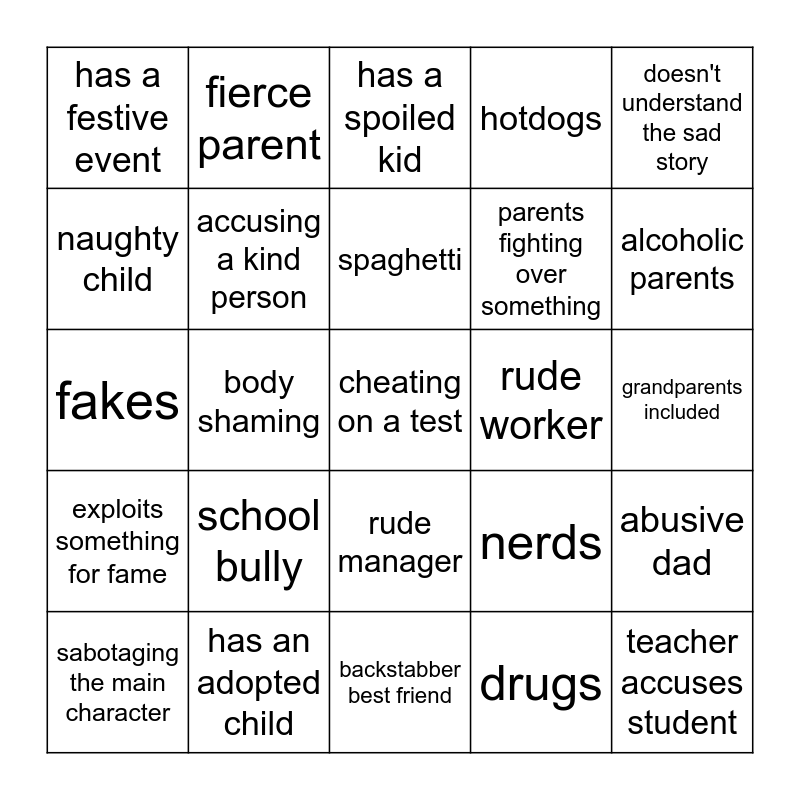 This bingo card has 25 words: school bully, backstabber best friend, spaghetti, sabotaging the main character, doesn't understand the sad story, has a festive event, naughty child, fierce parent, rude worker, rude manager, parents fighting over something, fakes, nerds, abusive dad, accusing a kind person, teacher accuses student, grandparents included, has a spoiled kid, alcoholic parents, body shaming, cheating on a test, has an adopted child, exploits something for fame, hotdogs and drugs.