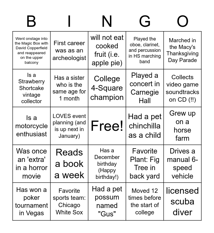 This bingo card has a free space and 34 words: Loves to crochet "little critters", Moved 12 times before the start of college, Is a "southpaw", Taught themselves calligraphy, Was once an 'extra' in a horror movie, Has a sister who is the same age for 1 month, Marched in the Macy's Thanksgiving Day Parade, Has won a poker tournament in Vegas, First career was as an archeologist, First concert attended: R.E.M., College 4-Square champion, will not eat cooked fruit (i.e. apple pie), Backpacked in Europe and ended at the 2012 Olympics in London, Caught rattlesnakes as a child, Had a pet chinchilla as a child, Collects video game soundtracks on CD (!!), Favorite sports team: Chicago White Sox, Is a motorcycle enthusiast, Reads a book a week, Favorite Plant: Fig Tree in back yard, Has a December birthday (Happy birthday!), Plays the Harry Potter audiobooks once a year, Went onstage into the Magic Box with David Copperfield and reappeared on the upper balcony, Grew up on a horse farm, Had a pet possum named "Gus", licensed scuba diver, Played the oboe, clarinet, and percussion in HS marching band, Vintage Strawberry Shortcake Collector, Played a concert in Carnegie Hall, Is a Strawberry Shortcake vintage collector, worked for the real-life competition that inspired "Pitch Perfect", LOVES event planning (and is up next in January), Drives a manual 6-speed vehicle and Collects elephants.