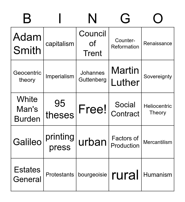 This bingo card has a free space and 38 words: Silk Road, Indian Ocean Trade Route, Atlantic System, Imperialism, Mercantilism, printing press, Johannes Guttenberg, Reformation, Renaissance, Martin Luther, 95 theses, Counter-Reformation, Humanism, Heliocentric Theory, Geocentric theory, Galileo, Nicholas Copernicus, Council of Trent, John Locke, Social Contract, Adam Smith, Protestants, Sovereignty, Estates General, Tennis Court Oath, bourgeoisie, guillotine, King Louis XVI, Marie Antoinette, agricultural revolution, enclosure acts, urban, rural, capitalism, communism, Factors of Production, White Man's Burden and Boxer Rebellion.