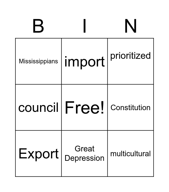 This bingo card has a free space and 8 words: Constitution, prioritized, import, Export, Mississippians, multicultural, council and Great Depression.