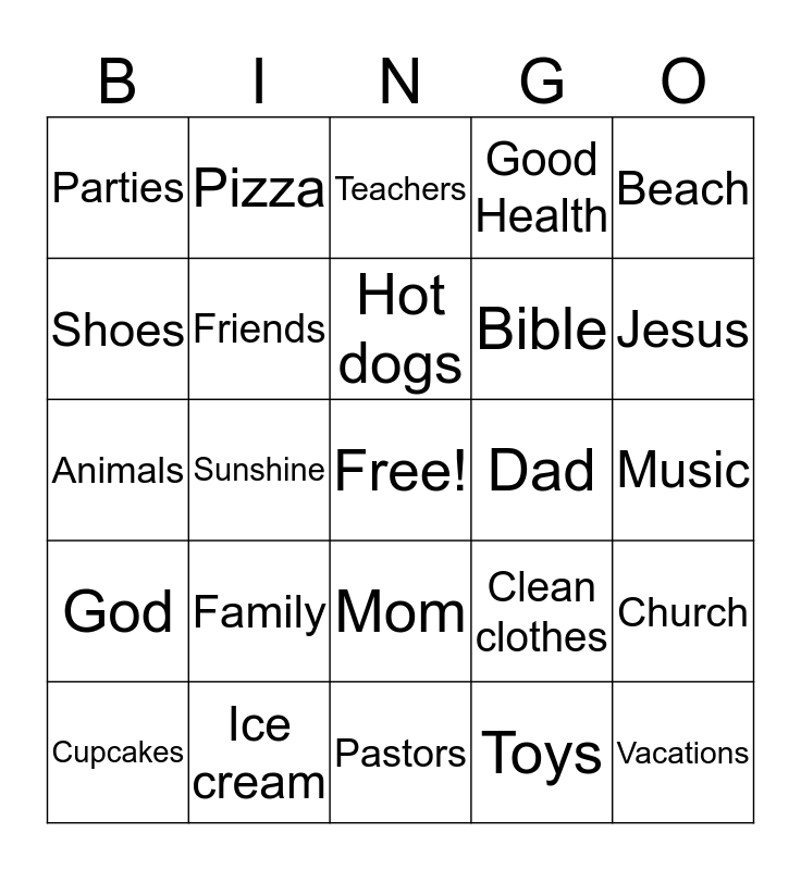 This bingo card has a free space and 24 words: Family, Ice cream, Hot dogs, Cupcakes, Beach, Parties, Shoes, Pizza, Dad, Mom, Bible, Animals, Clean clothes, Church, Friends, Toys, Music, Teachers, Jesus, Sunshine, Vacations, God, Good Health and Pastors.