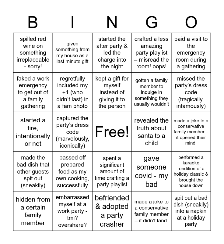 This bingo card has a free space and 24 words: passed off prepared food as my own cooking, successfully, embarrassed myself at a work party - tmi? overshare?, kept a gift for myself instead of giving it to the person, hidden from a certain family member, paid a visit to the emergency room during a gathering, spilled red wine on something irreplaceable - sorry!, faked a work emergency to get out of a family gathering, given something from my house as a last minute gift, revealed the truth about santa to a child, spent a significant amount of time crafting a party playlist, gotten a family member to indulge in something they usually wouldn’t, started a fire, intentionally or not, gave someone covid - my bad, performed a karaoke rendition of a holiday classic & brought the house down, regretfully included my +1 (who didn’t last) in a fam photo, made a joke to a conservative family member – it didn’t land., made a joke to a conservative family member – it opened their mind!, started the after party & led the charge into the night, missed the party’s dress code (tragically, infamously), captured the party’s dress code (marvelously, iconically), spit out a bad dish (sneakily) into a napkin at a holiday party, made the bad dish that other guests spit out (sneakily), crafted a less amazing party playlist – misread the room! oops! and befriended & adopted a party crasher.