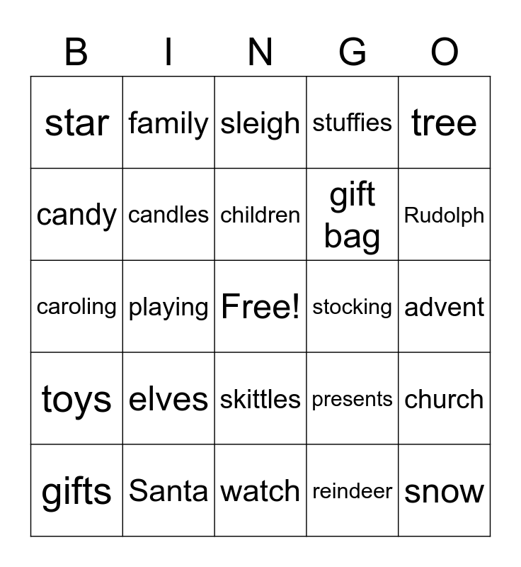 This bingo card has a free space and 24 words: elves, Santa, children, gifts, tree, star, candy, family, stocking, skittles, gift bag, caroling, presents, church, candles, reindeer, advent, sleigh, Rudolph, playing, snow, toys, stuffies and watch.