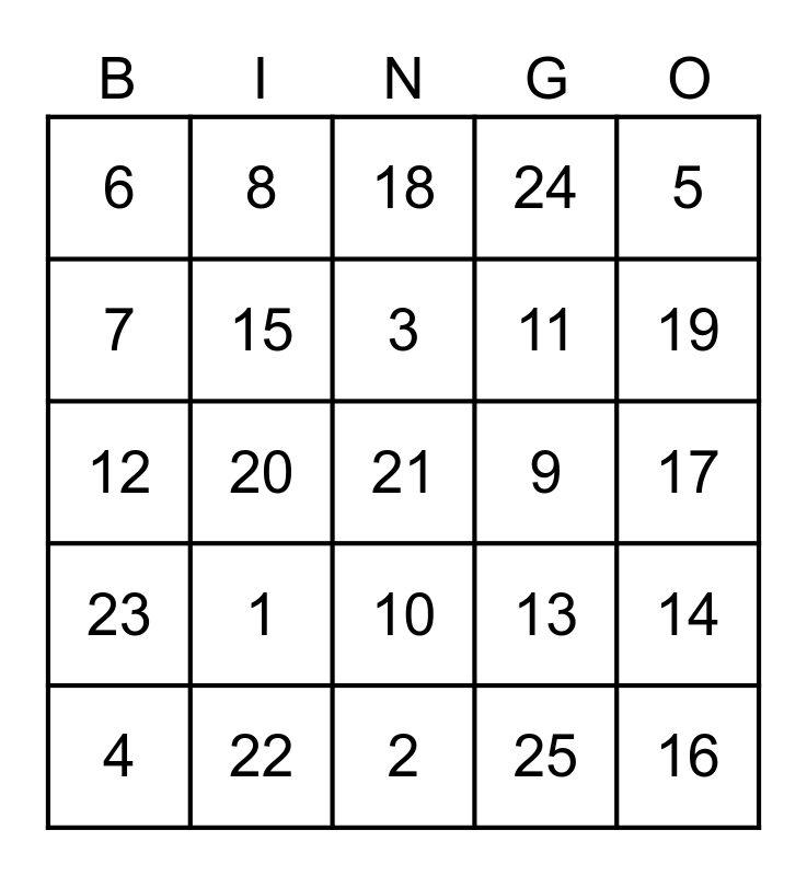 This bingo card has 25 words: 1, 2, 3, 4, 5, 6, 7, 8, 9, 10, 11, 12, 13, 14, 15, 16, 17, 18, 19, 20, 21, 22, 23, 24 and 25.
