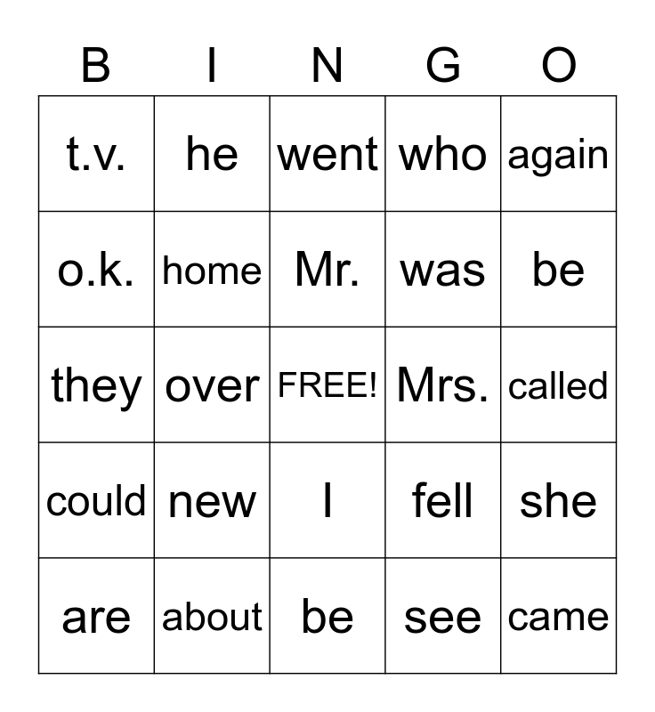 This bingo card has a free space and 29 words: are, has, over, too, t.v., went, home, new, Mrs., about, called, came, be, see, be, or, I, could, again, they, fell, go, was, o.k., who, he, she, Mr. and from.