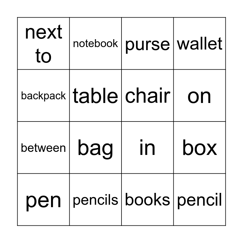 This bingo card has 16 words: pencils, box, purse, next to, between, notebook, in, books, backpack, table, pen, wallet, bag, on, chair and pencil.