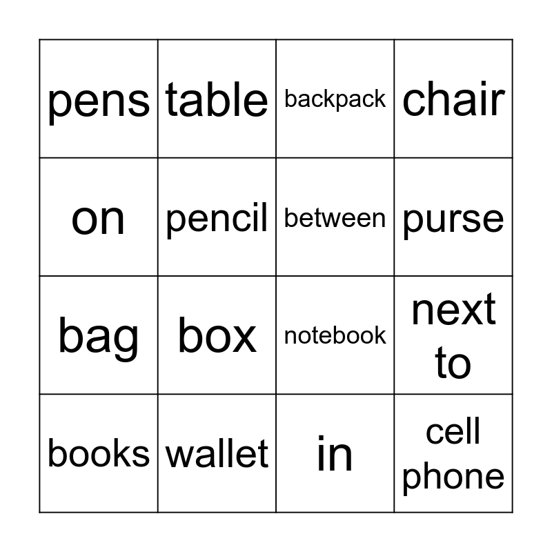 This bingo card has 16 words: wallet, next to, backpack, pens, bag, table, notebook, in, on, pencil, books, chair, box, purse, between and cell phone.