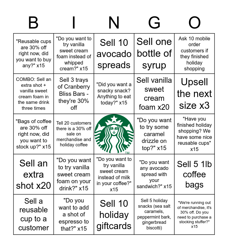 This bingo card has a free space and 24 words: "Do you want to try vanilla sweet cream foam on your drink?" x15, "Do you want to add a shot of espresso to that?" x15, "Did you want a snacky snack? Anything to eat today?" x15, Sell a reusable cup to a customer, Ask 10 mobile order customers if they finished holiday shopping, "Reusable cups are 30% off right now, did you want to buy any?" x15, COMBO: Sell an extra shot + vanilla sweet cream foam in the same drink three times, "Do you want to try vanilla sweet cream foam instead of whipped cream?" x15, "Do you want to try some caramel drizzle on top?" x15, "Do you want to try vanilla sweet cream instead of milk in your coffee?" x15, Sell vanilla sweet cream foam x20, "Bags of coffee are 30% off right now, did you want to stock up?" x15, "Do you want any avocado spread with your sandwich?" x15, Sell 5 1lb coffee bags, Sell 3 trays of Cranberry Bliss Bars - they're 30% off, Sell 5 holiday snacks (sea salt caramels, peppermint bark, gingerbread biscotti), "Have you finished holiday shopping? We have some nice reusable cups" x15, Sell 10 avocado spreads, Upsell the next size x3, Tell 20 customers there is a 30% off sale on merchandise and holiday coffee, "We're running out of merchandise, it's 30% off. Do you need to purchase a stocking stuffer?" x15, Sell an extra shot x20, Sell one bottle of syrup and Sell 10 holiday giftcards.