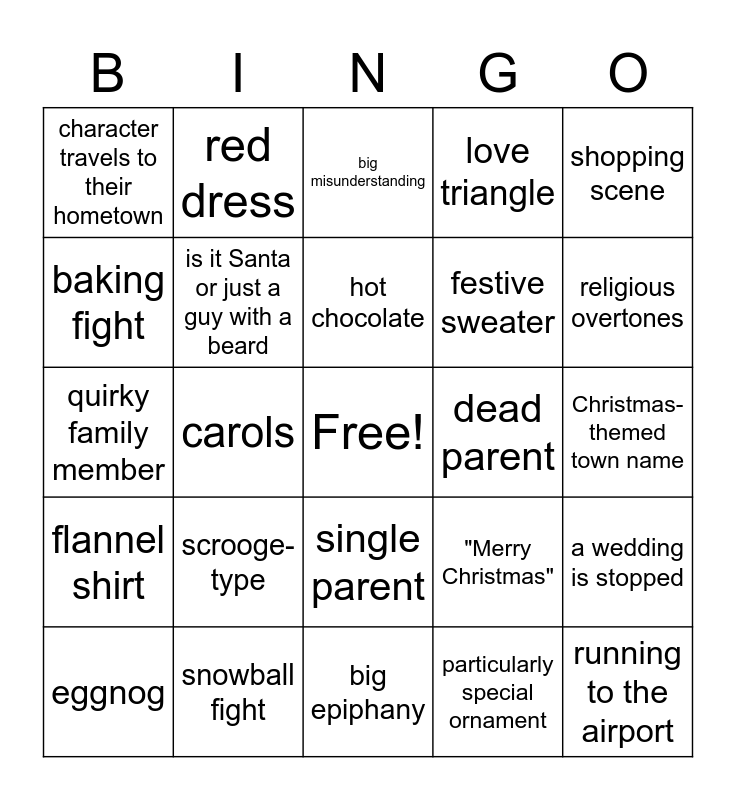 This bingo card has a free space and 49 words: way too wise kid, running to the airport, one starts nasty one starts nice, big epiphany, scrooge-type, "meaning of Christmas", red dress, ex shows up, baking fight, small town, is it Santa or just a guy with a beard, love triangle, a wedding is stopped, "Merry Christmas", snows at the perfect time, mistletoe, hot chocolate, dead parent, former child star actor, shopping scene, carols, particularly special ornament, character travels to their hometown, festive sweater, characters bump into each other, religious overtones, eggnog, interrupted right before they kiss, single parent, flannel shirt, 1st kiss right at the end, falling over on ice/snow, homemade cookies, handwritten letter, snowball fight, "New York", walk down the stairs dramatically, amnesia, Christmas-themed town name, someone is clumsy, proposal, dog, buying a Christmas tree, holding a mug in two hands, quirky family member, big misunderstanding, actors have zero chemistry, Magic? and Obvious Product Placement.