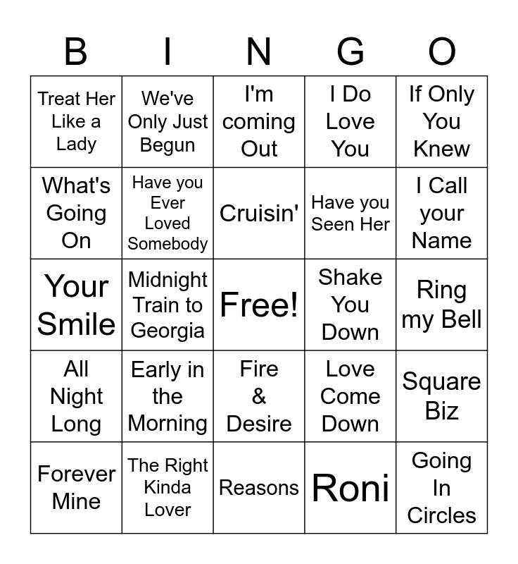 This bingo card has a free space and 74 words: You Dropped A Bomb on Me, Living for the Love of You, I'm coming Out, Last Dance, Diamond in the Back, Love and Happiness, I Wanna Dance With Somebody, Love T.K.O, Forever Mine, I'll Be There, Baby Love, Just my Imagination, Cruisin', What's Going On, Superstition, Midnight Train to Georgia, A Night to Remember, I Call your Name, The Second Time Around, Your Smile, Have you Ever Loved Somebody, We've Only Just Begun, I Do Love You, Sara Smile, Going In Circles, Sideshow, Everybody Plays the Fool, Wishing on a Star, Macarena, Feel the Fire, If Only You Knew, I'll Take You There, We Are Family, You Give Good Love, Billie Jean, Roni, Little Red Corvette, My Prerogative, Rhythm Nation, Before I Let Go, Reasons, The Right Kinda Lover, Get Down on It, Ain't Nobody, Don't Look Any Further, Treat Her Like a Lady, No One's Gonna Love You, Early in the Morning, Just Be Good to Me, Cutie Pie, And the Beat Goes On, She's a Bad Mama Jama, Ring my Bell, Candy, Joy & Pain, Saturday Love, Fire & Desire, Giving you the Best that I've Got, Just a Touch of Love, Square Biz, Have you Seen Her, Ain't No Woman(Like the one I've Got), All Night Long, Cold Blooded, Shake You Down, All This Love, Encore, Street Life, Love Come Down, Boogie Oogie Oogie, ZOOM, Too Hot, Time of my Life and Happy Feelings.