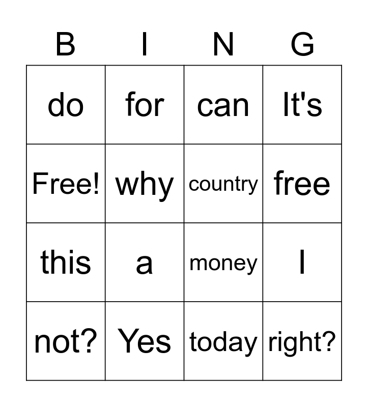 This bingo card has 16 words: Yes, I, can, do, this, for, money, today, Free!, why, not?, It's, a, free, country and right?.