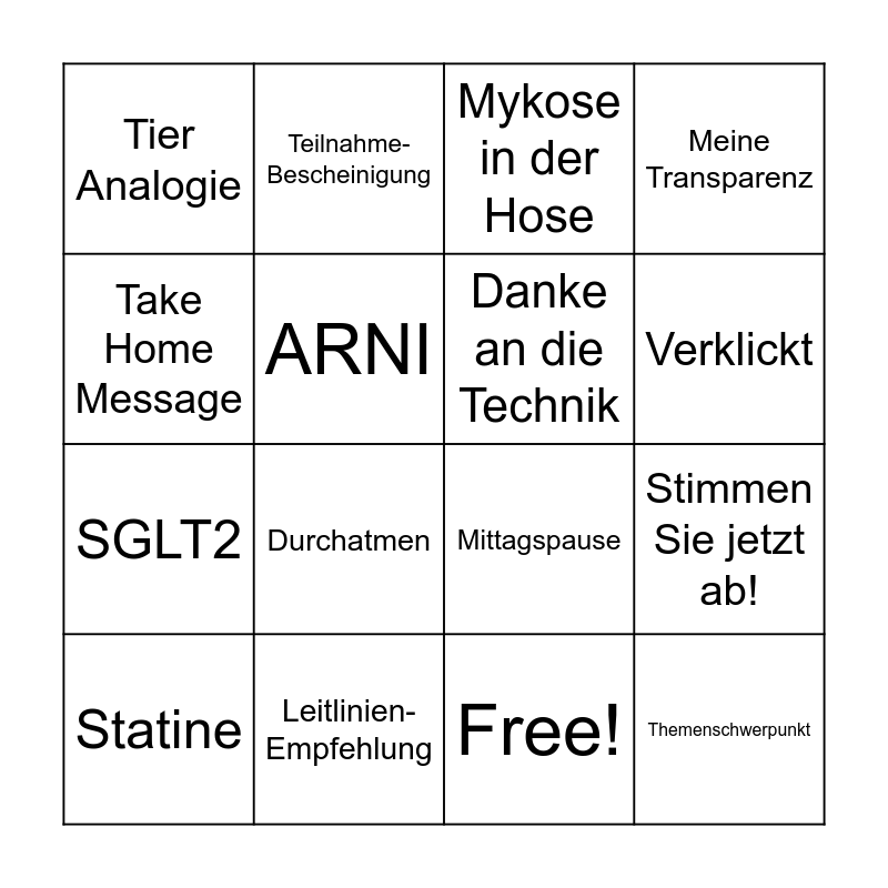 This bingo card has 17 words: Free!, Statine, Mykose in der Hose, Tier Analogie, Durchatmen, Meine Transparenz, Stimmen Sie jetzt ab!, Danke an die Technik, Verklickt, ARNI, Leitlinien-Empfehlung, Mittagspause, Take Home Message, Teilnahme-Bescheinigung, SGLT2, Handbreit dazwischen and Themenschwerpunkt.