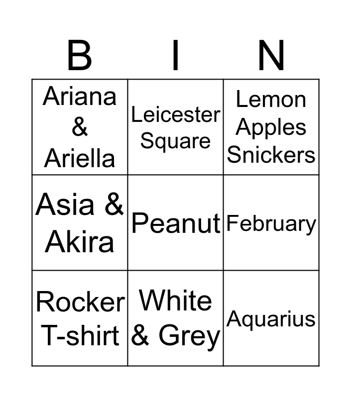 This bingo card has 12 words: Bali, Aquarius, Peanut, February, Leicester Square, Lemon Apples Snickers, White & Grey, At dinner whilst pretending to take a photo, Ariana & Ariella, Asia & Akira, Rocker T-shirt and 8lb 5oz.