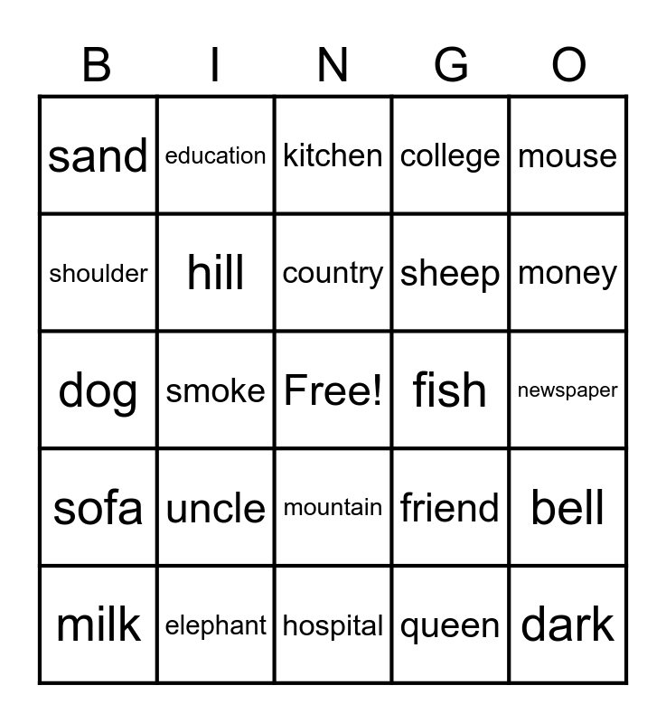 This bingo card has a free space and 63 words: garden, brother, bread, bell, army, cake, education, dinner, country, mother, mountain, neighbour, newspaper, mouse, star, shoulder, smoke, sand, torch, sheep, uncle, sofa, college, world, TV, ice, snow, tomorrow, ten, taxi, tooth, room, monkey, medicine, money, milk, king, queen, horse, hill, dog, fish, clouds, dance, dark, elephant, egg, friend, goat, grandfather, husband, hospital, hotel, iron, juice, kitchen, knee, listen, map, nose, ocean, police and plant.