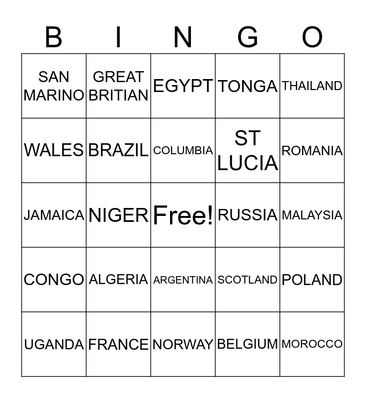 This bingo card has a free space and 24 words: ALGERIA, FRANCE, COLUMBIA, UGANDA, THAILAND, SAN MARINO, WALES, GREAT BRITIAN, RUSSIA, ARGENTINA, ST LUCIA, JAMAICA, SCOTLAND, POLAND, BRAZIL, BELGIUM, MALAYSIA, EGYPT, ROMANIA, NIGER, MOROCCO, CONGO, TONGA and NORWAY.