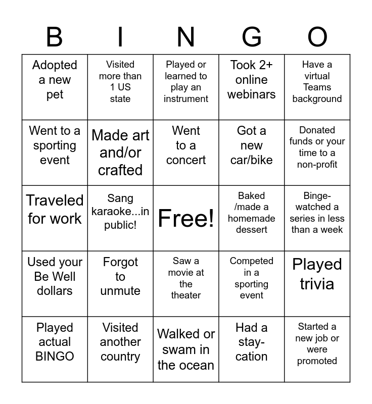 This bingo card has a free space and 24 words: Forgot to unmute, Visited another country, Went to a concert, Played actual BINGO, Have a virtual Teams background, Adopted a new pet, Went to a sporting event, Visited more than 1 US state, Baked /made a homemade dessert, Saw a movie at the theater, Got a new car/bike, Traveled for work, Competed in a sporting event, Played trivia, Made art and/or crafted, Had a stay-cation, Binge-watched a series in less than a week, Played or learned to play an instrument, Donated funds or your time to a non-profit, Sang karaoke...in public!, Started a new job or were promoted, Used your Be Well dollars, Took 2+ online webinars and Walked or swam in the ocean.
