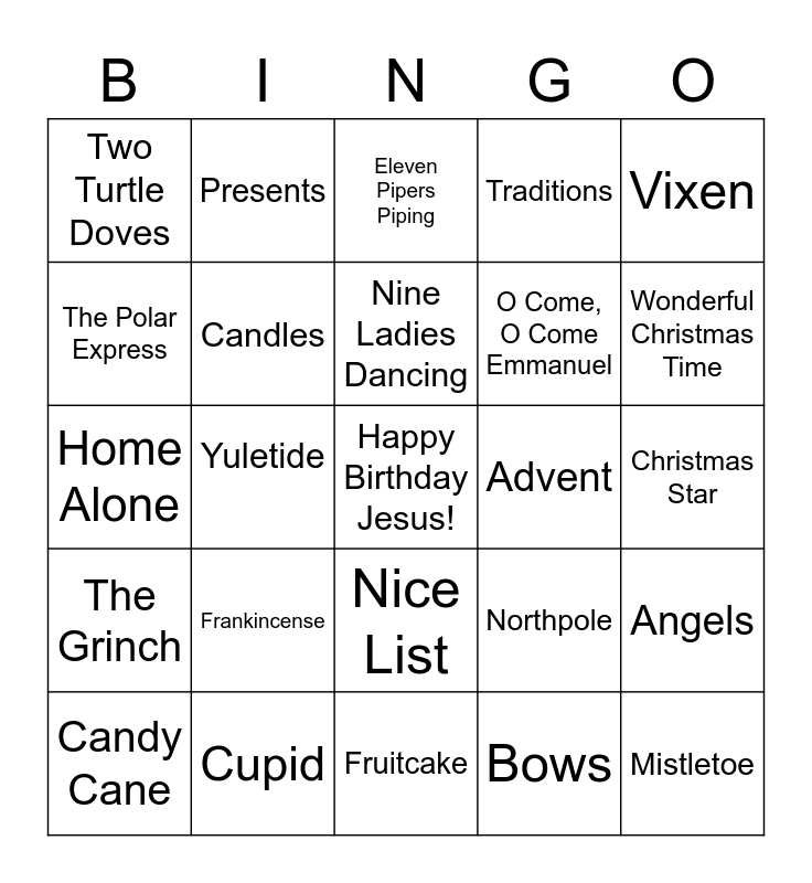 This bingo card has a free space and 24 words: Frankincense, Cupid, Nine Ladies Dancing, Candy Cane, Vixen, Two Turtle Doves, The Polar Express, Presents, Advent, Nice List, O Come, O Come Emmanuel, Home Alone, Northpole, Angels, Candles, Bows, Christmas Star, Eleven Pipers Piping, Wonderful Christmas Time, Yuletide, Mistletoe, The Grinch, Traditions and Fruitcake.