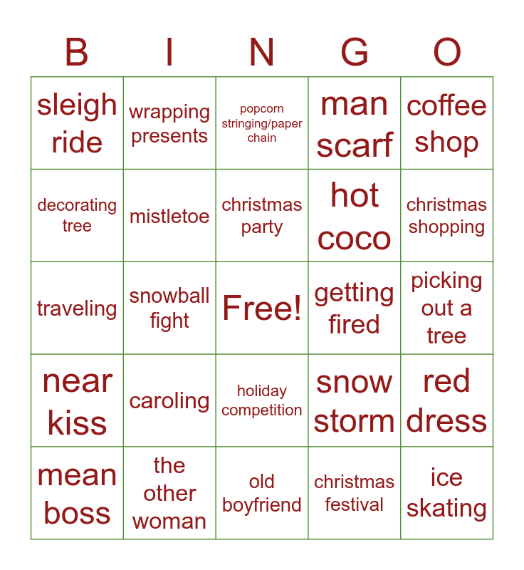 This bingo card has a free space and 28 words: red dress, santa, hot coco, christmas festival, decorating tree, popcorn stringing/paper chain, wrapping presents, near kiss, getting fired, mean boss, traveling, man scarf, the other woman, old boyfriend, christmas shopping, christmas cookies, caroling, mistletoe, christmas party, holiday competition, sleigh ride, snow scene, ice skating, snowball fight, picking out a tree, snow storm, coffee shop and tree expert.