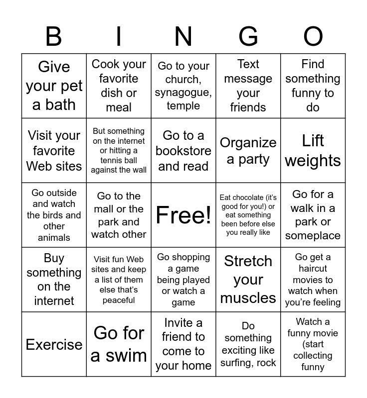 This bingo card has a free space and 71 words: Talk to a friend on the telephone, Cook your favorite dish or meal, Go out and visit a friend, Cook a recipe that you’ve never tried before, Invite a friend to come to your home, Take a cooking class, Text message your friends, Go out for something to eat, Organize a party, Go outside and play with your pet, Exercise, Go borrow a friend’s dog and take it to the park, Lift weights, Give your pet a bath, Do yoga, tai chi, or Pilates, or take classes to learn, Go outside and watch the birds and other animals, Stretch your muscles, Find something funny to do, Eat your favorite ice cream Sunday comics, Go for a walk in a park or someplace, Visit fun Web sites and keep a list of them else that’s peaceful, Watch a funny movie (start collecting funny, Go get a haircut movies to watch when you’re feeling, Sleep or take a nap overwhelmed), Go outside and watch the clouds, Go to the movies, Go jog, Watch television, Ride your bike, Listen to the radio, Go for a swim, Go to a sporting event, like a baseball game, Go hiking, Play a game with a friend, Do something exciting like surfing, rock, Play solitaire climbing, skiing, skydiving, motorcycle, Play video games riding, or kayaking, or go learn how to do, Go online to chat one of these things, Visit your favorite Web sites, Go to your local playground and join, Go shopping a game being played or watch a game, Do a puzzle with a lot of pieces, Buy something on the internet, Sell something you don’t want on the internet, Go play something you can do by yourself, Create your own Web site if no one else is around, like basketball,, Join an internet dating site bowling, handball, miniature golf, billiards,, But something on the internet or hitting a tennis ball against the wall, Get a massage, Get out of your house, even if you just, Go for a drive in your car or go for a ride on just sit outside public transportation, Plan a trip to somewhere you’ve never, Eat chocolate (it’s good for you!) or eat something been before else you really like, Go to a spa, Sign up for a class that excites you at a local, Go to a library college, adult school or online, Go to a bookstore and read, Read your favorite book, magazine or newspaper, Go to your favorite café for coffee or tea, Read a trashy celebrity magazine, Visit a museum or local art gallery, Write a letter to a friend or family member, Go to the mall or the park and watch other, Write things you like about yourself on paper people; try to imagine what they’re thinking, Pray or meditate, Write a poem, story, movie or play, Go to your church, synagogue, temple, Write in your journal or other place of worship, Write a loving letter to yourself when you’re, Join a group feeling good and keep it with you to read when and Write a letter to your higher power you’re feeling upset.