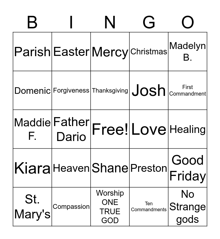 This bingo card has a free space and 29 words: St. Mary's, Father Ray, Father Dario, Deacon Dave, Parish, Mercy, Forgiveness, Heaven, Love, Compassion, Healing, No Strange gods, Worship ONE TRUE GOD, Ten Commandments, First Commandment, God is #1, Shane, Kiara, Madelyn B., Maddie F., Preston, Keith, Josh, Domenic, Christmas, Easter, Good Friday, Thanksgiving and All Saints Day.