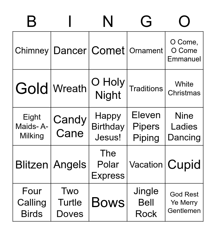 This bingo card has a free space and 24 words: Angels, Two Turtle Doves, O Holy Night, Four Calling Birds, O Come, O Come Emmanuel, Chimney, Gold, Dancer, Eleven Pipers Piping, The Polar Express, Traditions, Eight Maids- A- Milking, Vacation, Cupid, Wreath, Jingle Bell Rock, Nine Ladies Dancing, Comet, White Christmas, Candy Cane, God Rest Ye Merry Gentlemen, Blitzen, Ornament and Bows.