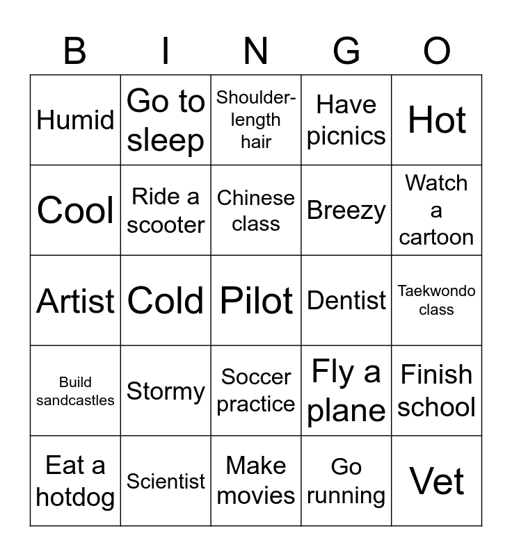 This bingo card has 64 words: Free!, Wake up, Start school, Finish school, Come home, Eat dinner, Go to sleep, Band practice, Chinese class, Dance class, Soccer practice, Swimming class, Taekwondo class, Hot, Warm, Cool, Cold, Humid, Dry, Breezy, Stormy, Build sandcastles, Have picnics, Go sledding, Go to the beach, Make snowmen, Pick apples, Plant flowers, Rake leaves, Clean the room, Listen to stories, Play video games, Study English, Talk on the phone, Watch a cartoon, Eat a hotdog, Fly a kite, Go running, Read a book, Ride a scooter, Artist, Dentist, Race car driver, Farmer, Firefighter, Pilot, Scientist, Vet, Fly a plane, Go to space, Help sick animals, Build houses, Make movies, Teach children, Travel the world, Short hair, Shoulder-length hair, Long hair, Straight hair, Curly hair, Ponytail, Beard, Mustache and Glasses.