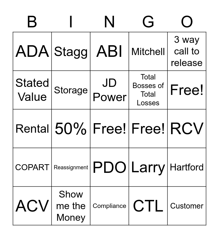 This bingo card has a free space and 29 words: ACV, Free!, 50%, Loyalty, ADA, ABI, Storage, Reassignment, Free!, Show me the Money, RCV, Customer, Compliance, CTL, Free!, EFT, PDO, COPART, 3 way call to release, Rental, Larry, COPART, Total Bosses of Total Losses, Stated Value, Mitchell, Stagg, Hartford, JD Power and ERAC.