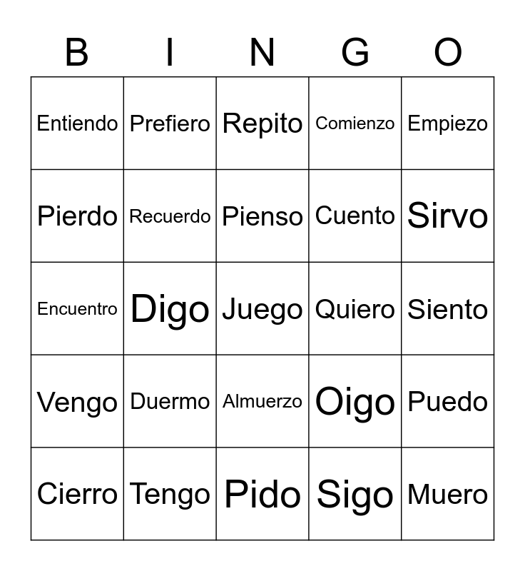 This bingo card has 25 words: Duermo, Pido, Pienso, Cierro, Empiezo, Entiendo, Pierdo, Prefiero, Quiero, Almuerzo, Cuento, Encuentro, Oigo, Puedo, Recuerdo, Muero, Siento, Repito, Sirvo, Digo, Juego, Tengo, Vengo, Comienzo and Sigo.