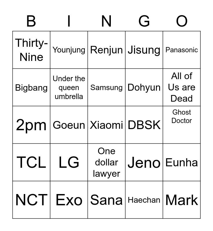 This bingo card has a free space and 24 words: LG, Exo, Samsung, NCT, Panasonic, Thirty-Nine, Bigbang, Younjung, DBSK, One dollar lawyer, Dohyun, 2pm, Jeno, Eunha, Under the queen umbrella, Haechan, Ghost Doctor, Renjun, All of Us are Dead, Goeun, Mark, TCL, Jisung and Sana.