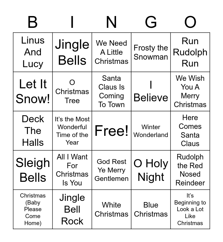 This bingo card has a free space and 24 words: All I Want For Christmas Is You, Jingle Bell Rock, Santa Claus Is Coming To Town, Christmas (Baby Please Come Home), Run Rudolph Run, Linus And Lucy, Let It Snow!, Jingle Bells, Winter Wonderland, God Rest Ye Merry Gentlemen, I Believe, Deck The Halls, O Holy Night, Rudolph the Red Nosed Reindeer, O Christmas Tree, Blue Christmas, Here Comes Santa Claus, We Need A Little Christmas, We Wish You A Merry Christmas, It’s the Most Wonderful Time of the Year, It’s Beginning to Look a Lot Like Christmas, Sleigh Bells, Frosty the Snowman and White Christmas.