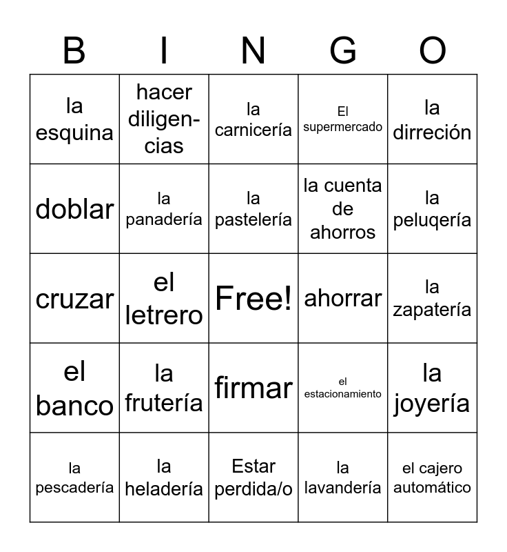 This bingo card has a free space and 24 words: la frutería, la heladería, la pastelería, la pescadería, la dirreción, la esquina, doblar, hacer diligen- cias, ahorrar, firmar, la cuenta de ahorros, cruzar, el estacionamiento, la joyería, la panadería, la lavandería, la zapatería, la carnicería, la peluqería, el letrero, el cajero automático, el banco, El supermercado and Estar perdida/o.