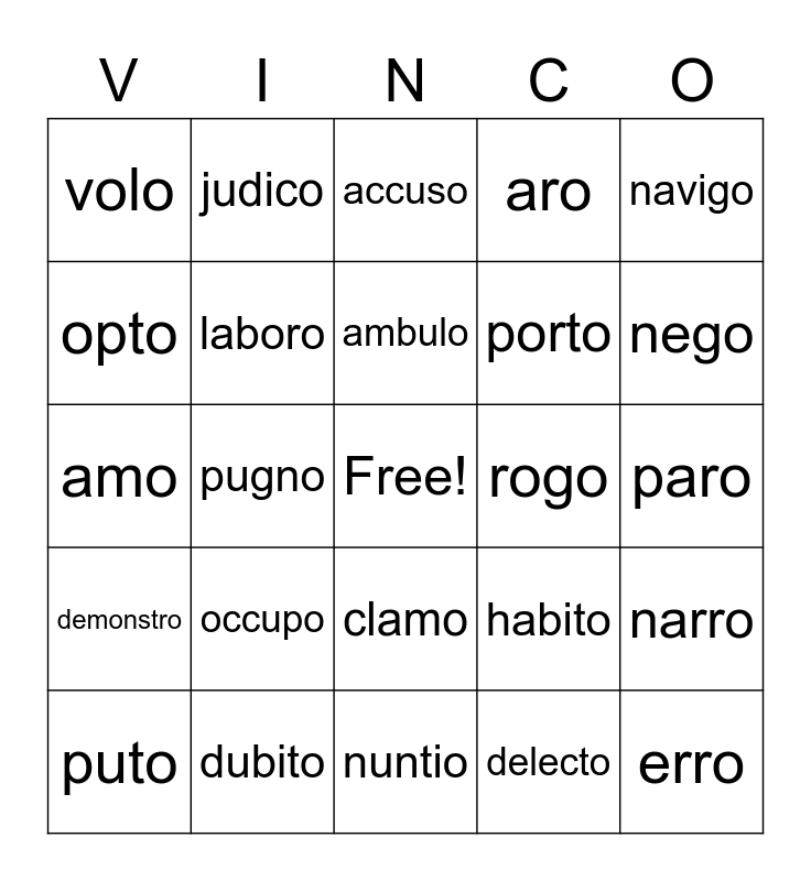 This bingo card has a free space and 38 words: voco, oro, laudo, laboro, narro, occupo, ambulo, perturbo, navigo, porto, pugno, aro, erro, paro, opto, demonstro, supero, accuso, celo, rogo, volo, dubito, nego, puto, muto, nuntio, vulnero, culpo, exspecto, creo, lavo, clamo, delecto, judico, juvo, habito, amo and nato.