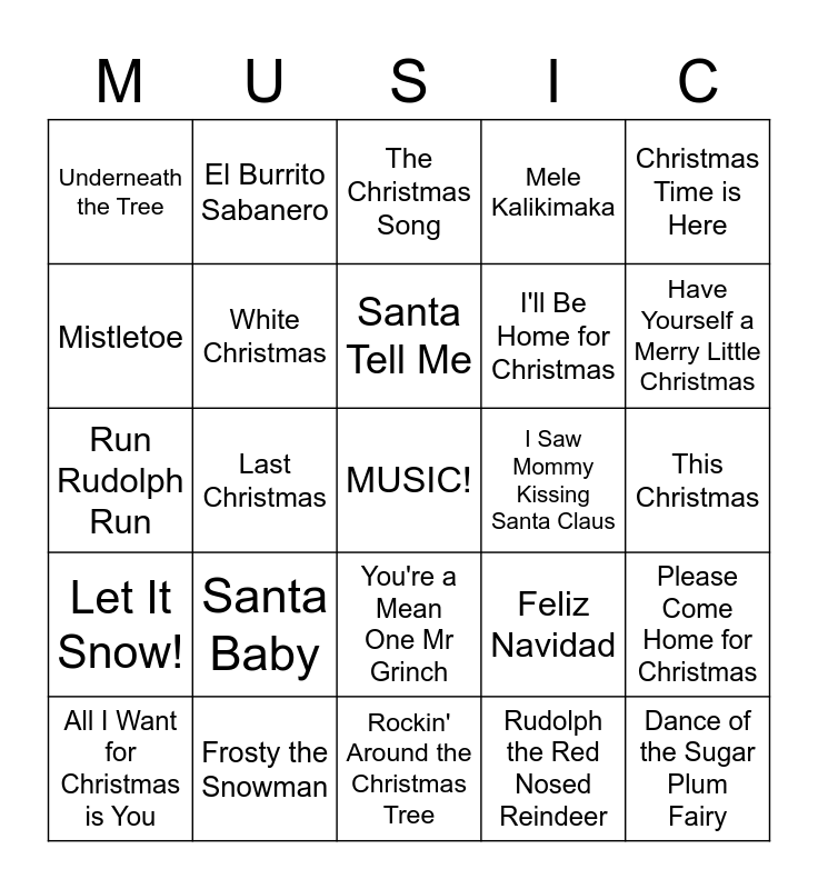 This bingo card has a free space and 39 words: Holly Jolly Christmas, Sleigh Ride, Jingle Bell Rock, White Christmas, All I Want for Christmas is You, You're a Mean One Mr Grinch, Santa Tell Me, Carol of the Bells, Christmas Time is Here, Let It Snow!, Last Christmas, Mele Kalikimaka, Dance of the Sugar Plum Fairy, This Christmas, I Saw Mommy Kissing Santa Claus, Santa Baby, Blue Christmas, Underneath the Tree, Believe, Feliz Navidad, Mistletoe, Rockin' Around the Christmas Tree, I'll Be Home for Christmas, Have Yourself a Merry Little Christmas, Silent Night, The First Noel, Up on the Housetop, Jingle Bells, God Rest Ye Merry Gentlemen, El Burrito Sabanero, SAnta Claus is Coming to Town, I Want a Hippopotamus for Christmas, The Christmas Song, Frosty the Snowman, Rudolph the Red Nosed Reindeer, Somewhere in My Memory, Please Come Home for Christmas, Run Rudolph Run and Deck the Halls.