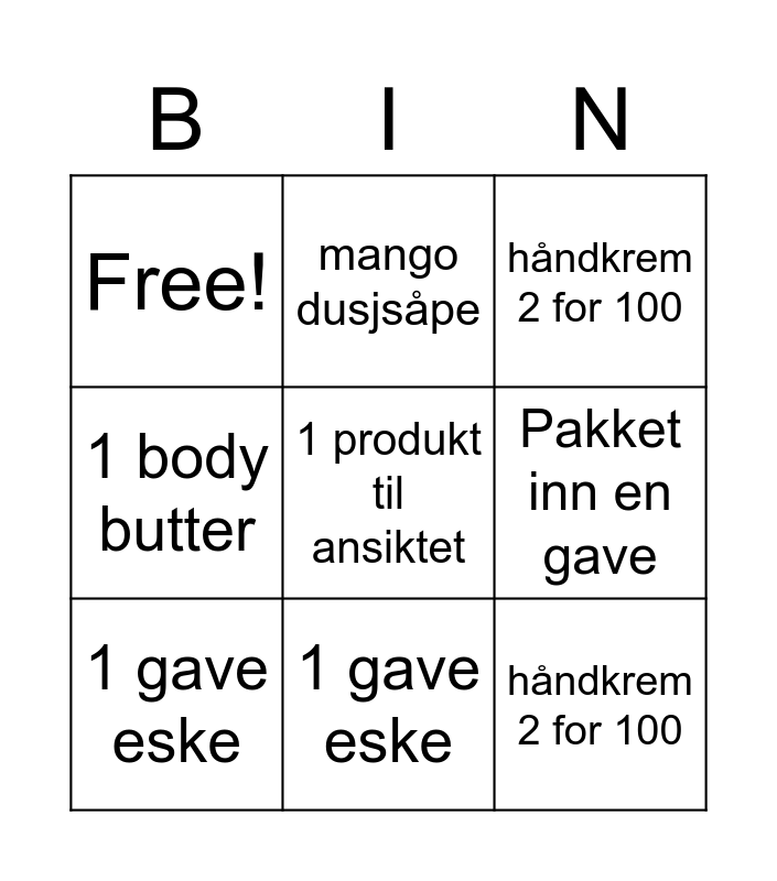 This bingo card has 9 words: 1 gave eske, håndkrem 2 for 100, mango dusjsåpe, 1 body butter, Free!, Pakket inn en gave, 1 produkt til ansiktet, håndkrem 2 for 100 and 1 gave eske.