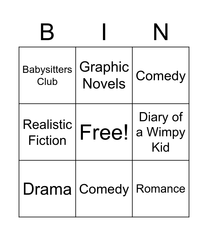 This bingo card has a free space and 16 words: Harry Potter, Realistic Fiction, Comedy, Babysitters Club, Diary of a wimpy kid, Graphic Novels, Science Fiction, Fantasy, Romance, Diary of a Wimpy Kid, Plays, Realistic Fiction, Realistic Fiction, Comedy, Drama and Science Fiction.