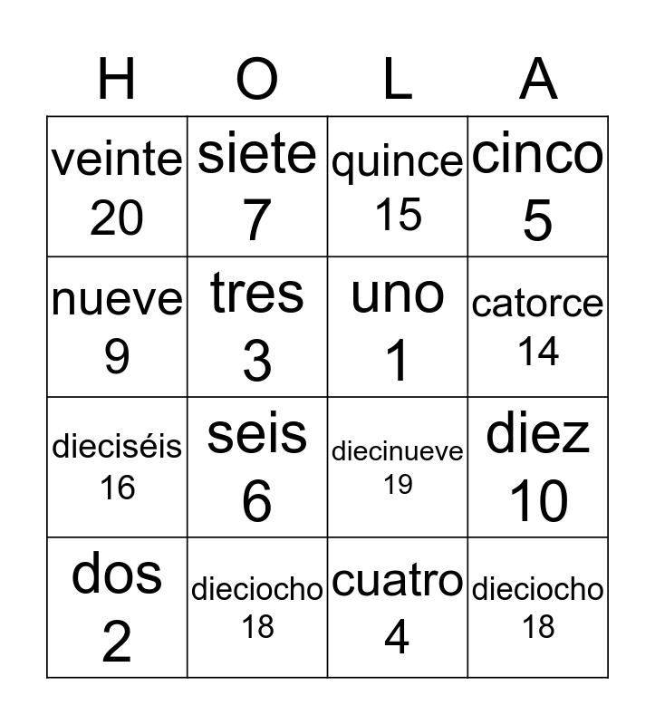 This bingo card has a free space and 15 words: dos 2, dieciocho 18, quince 15, veinte 20, catorce 14, nueve 9, seis 6, cuatro 4, tres 3, dieciséis 16, diez 10, cinco 5, uno 1, siete 7 and dieciocho 18.