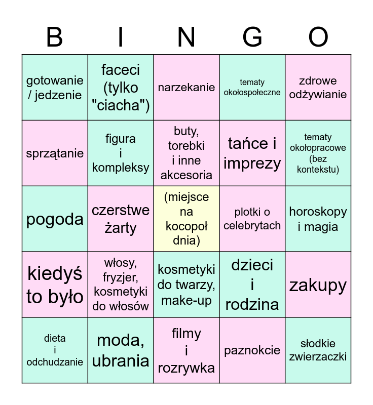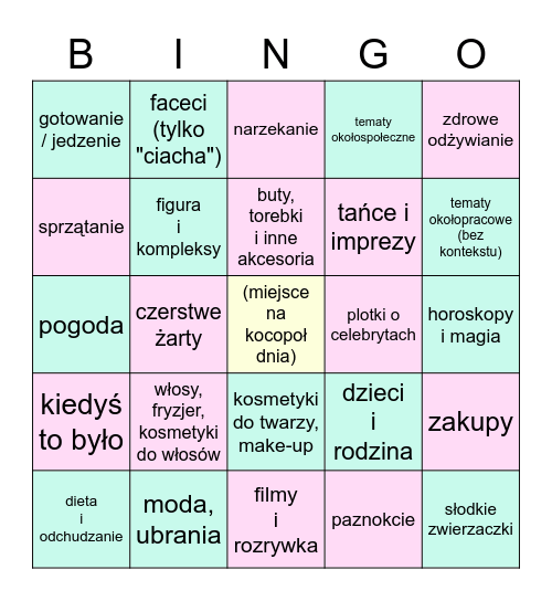 This bingo card has a free space and 24 words: włosy, fryzjer, kosmetyki do włosów, moda, ubrania, buty, torebki i inne akcesoria, dieta i odchudzanie, zdrowe odżywianie, gotowanie / jedzenie, sprzątanie, faceci (tylko "ciacha"), plotki o celebrytach, kosmetyki do twarzy, make-up, tańce i imprezy, pogoda, dzieci i rodzina, zakupy, figura i kompleksy, paznokcie, horoskopy i magia, narzekanie, tematy okołopracowe (bez kontekstu), czerstwe żarty, słodkie zwierzaczki, kiedyś to było, tematy okołospołeczne and filmy i rozrywka.