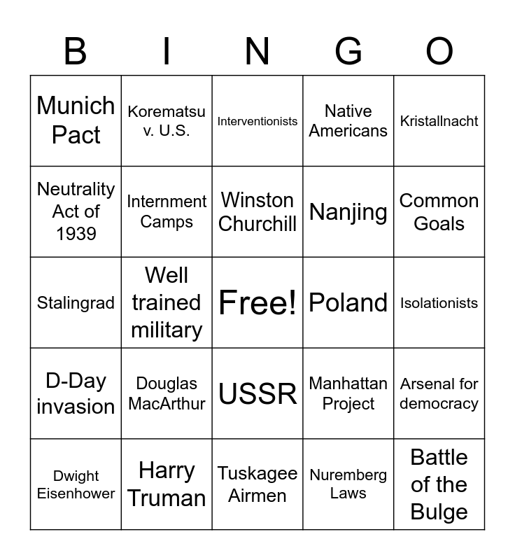 This bingo card has a free space and 24 words: Douglas MacArthur, Harry Truman, Winston Churchill, Dwight Eisenhower, Kristallnacht, Munich Pact, Neutrality Act of 1939, Korematsu v. U.S., Poland, USSR, Nanjing, Stalingrad, Manhattan Project, Arsenal for democracy, Internment Camps, Nuremberg Laws, Isolationists, Interventionists, Common Goals, Well trained military, Battle of the Bulge, D-Day invasion, Native Americans and Tuskagee Airmen.