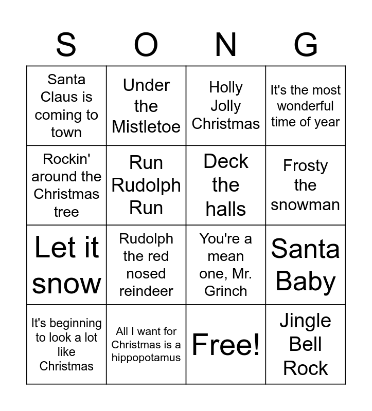 This bingo card has 16 words: It's beginning to look a lot like Christmas, All I want for Christmas is a hippopotamus, Holly Jolly Christmas, It's the most wonderful time of year, Rockin' around the Christmas tree, Under the Mistletoe, You're a mean one, Mr. Grinch, Santa Baby, Santa Claus is coming to town, Run Rudolph Run, Free!, Frosty the snowman, Let it snow, Rudolph the red nosed reindeer, Deck the halls and Jingle Bell Rock.