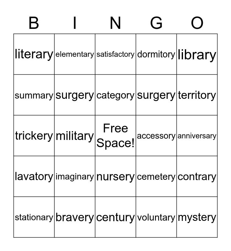 This bingo card has a free space and 24 words: imaginary, bravery, category, stationary, library, literary, summary, elementary, accessory, nursery, surgery, trickery, cemetery, contrary, surgery, voluntary, anniversary, satisfactory, territory, military, mystery, lavatory, dormitory and century.