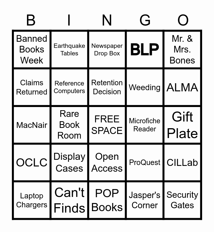 This bingo card has 2 images, a free space and 57 words: Shifting Project, Can't Finds, Acquisitions, OCLC, Jasper's Corner, Supply Cabinet, Reference Computers, Interlibrary Loan, Weeding, SCELC, BLP, Gov Docs, Claims Returned, Course Reserves, Cataloging, Banned Books Week, Security Gates, Mr. & Mrs. Bones, Elevator "Out of Order", Retention Decision, Microfiche Reader, Newspaper Drop Box, Laptop Chargers, CILLab, Cubicles, Current Periodicals, Book Drop, Institutional Repository, ALMA, Millennium, Auto-Graphics, Innopac, Earthquake Tables, New Book Table, Archives, Rare Book Room, Book Truck, MacNair, CHOICE Cards, Display Cases, Gift Plate, Not Enough Electrical Outlets, Dictionary Stand, Shelf reading, Juvenile Collection, JSTOR, Open Access, POP Books, ACE Collection, Information Literacy, ALURA, Chem Abstracts, WorldCat, ProQuest, EBSCO, ALA and Overdue Notice.