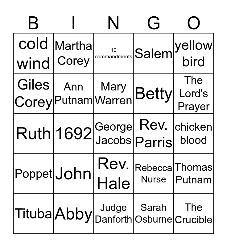 This bingo card has a free space and 24 words: John, Abby, Mary Warren, Tituba, yellow bird, cold wind, Giles Corey, Martha Corey, Rev. Parris, Rev. Hale, Betty, Ruth, Rebecca Nurse, Thomas Putnam, Ann Putnam, Sarah Osburne, chicken blood, 10 commandments, The Lord's Prayer, 1692, The Crucible, Poppet, Salem and Judge Danforth.