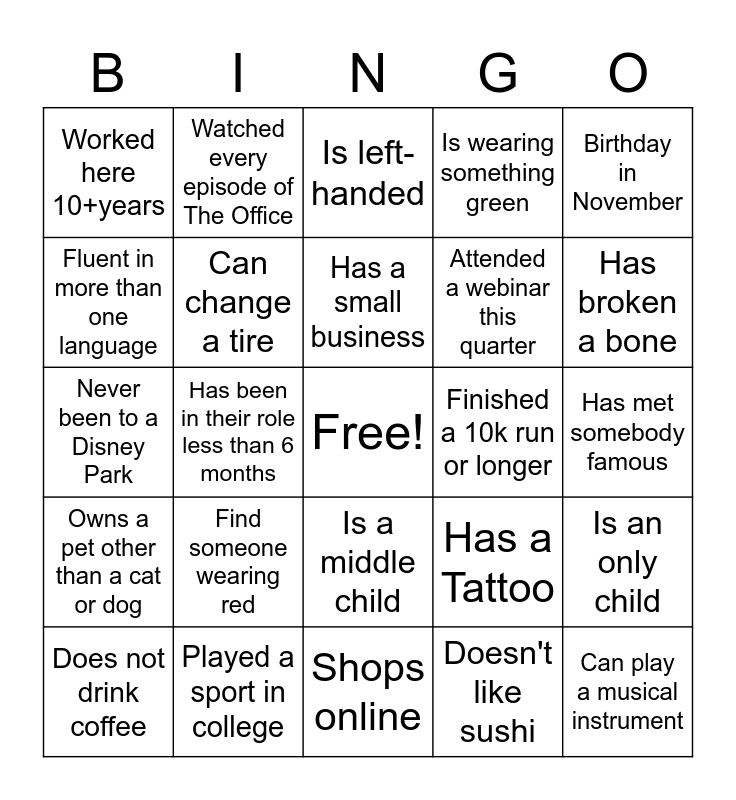 This bingo card has a free space and 24 words: Find someone wearing red, Played a sport in college, Has a small business, Does not drink coffee, Birthday in November, Worked here 10+years, Fluent in more than one language, Watched every episode of The Office, Finished a 10k run or longer, Is a middle child, Attended a webinar this quarter, Never been to a Disney Park, Has a Tattoo, Is an only child, Can change a tire, Doesn't like sushi, Has met somebody famous, Is left-handed, Has broken a bone, Has been in their role less than 6 months, Can play a musical instrument, Owns a pet other than a cat or dog, Is wearing something green and Shops online.
