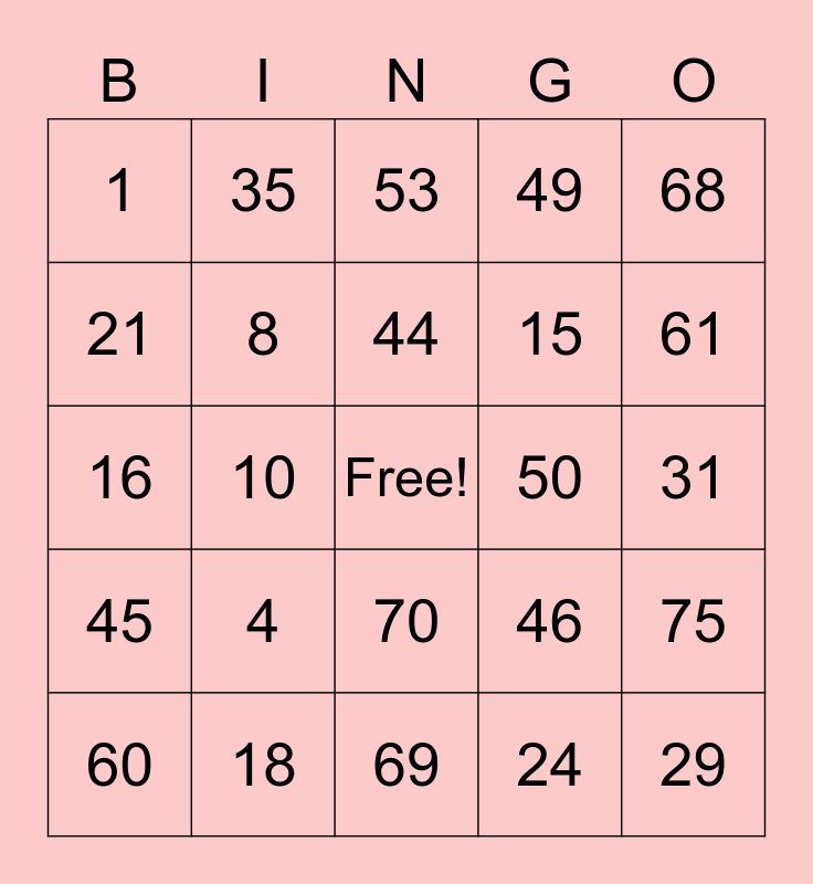 This bingo card has a free space and 24 words: 4, 18, 44, 60, 68, 1, 21, 35, 50, 70, 15, 16, 46, 75, 8, 24, 31, 53, 61, 10, 29, 45, 49 and 69.