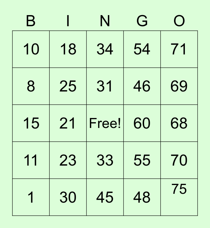 This bingo card has a free space and 24 words: 1, 23, 31, 48, 71, 10, 18, 34, 60, 68, 15, 25, 55, 70, 8, 30, 45, 54, 69, 11, 21, 33, 46 and 75.